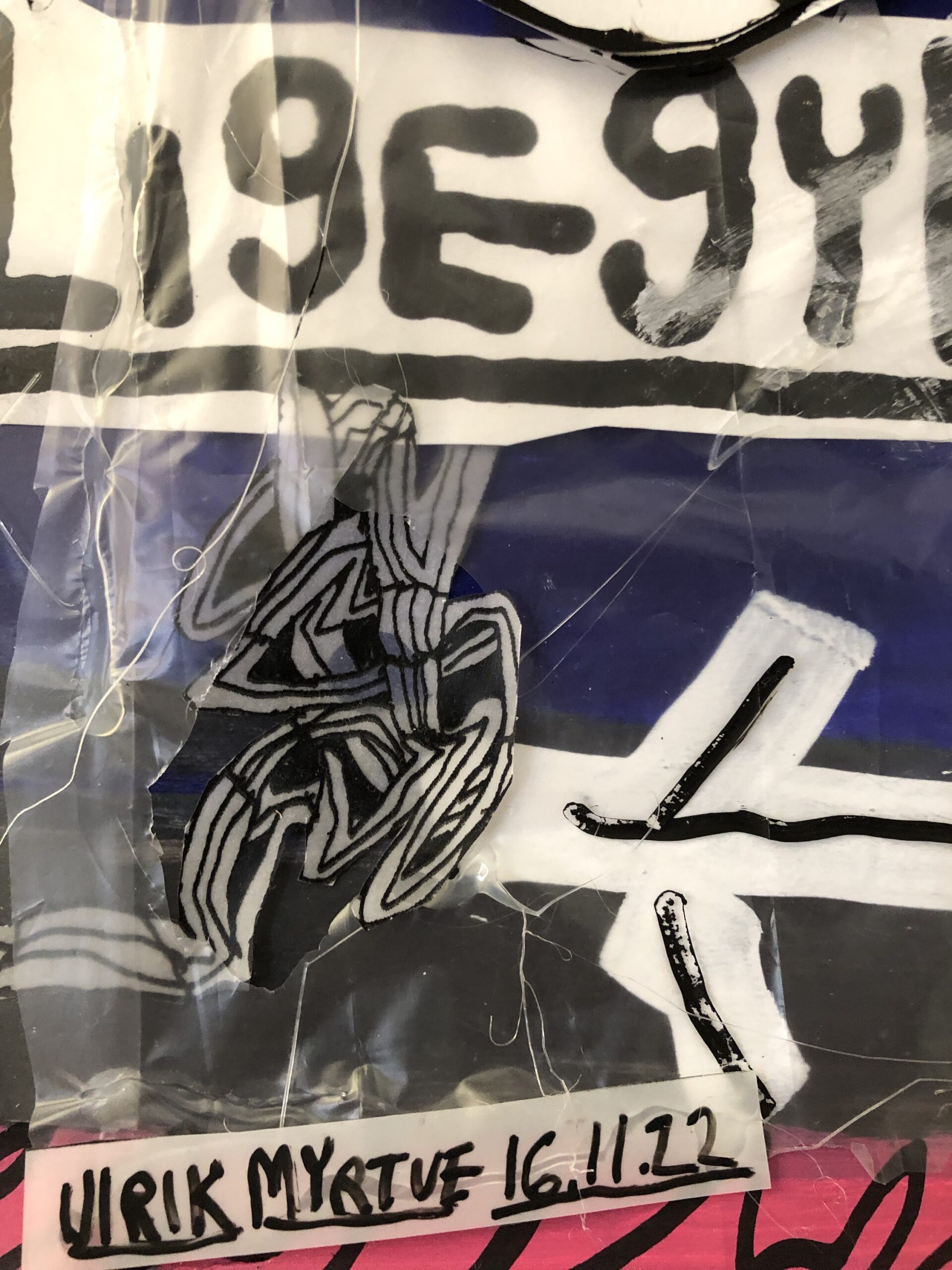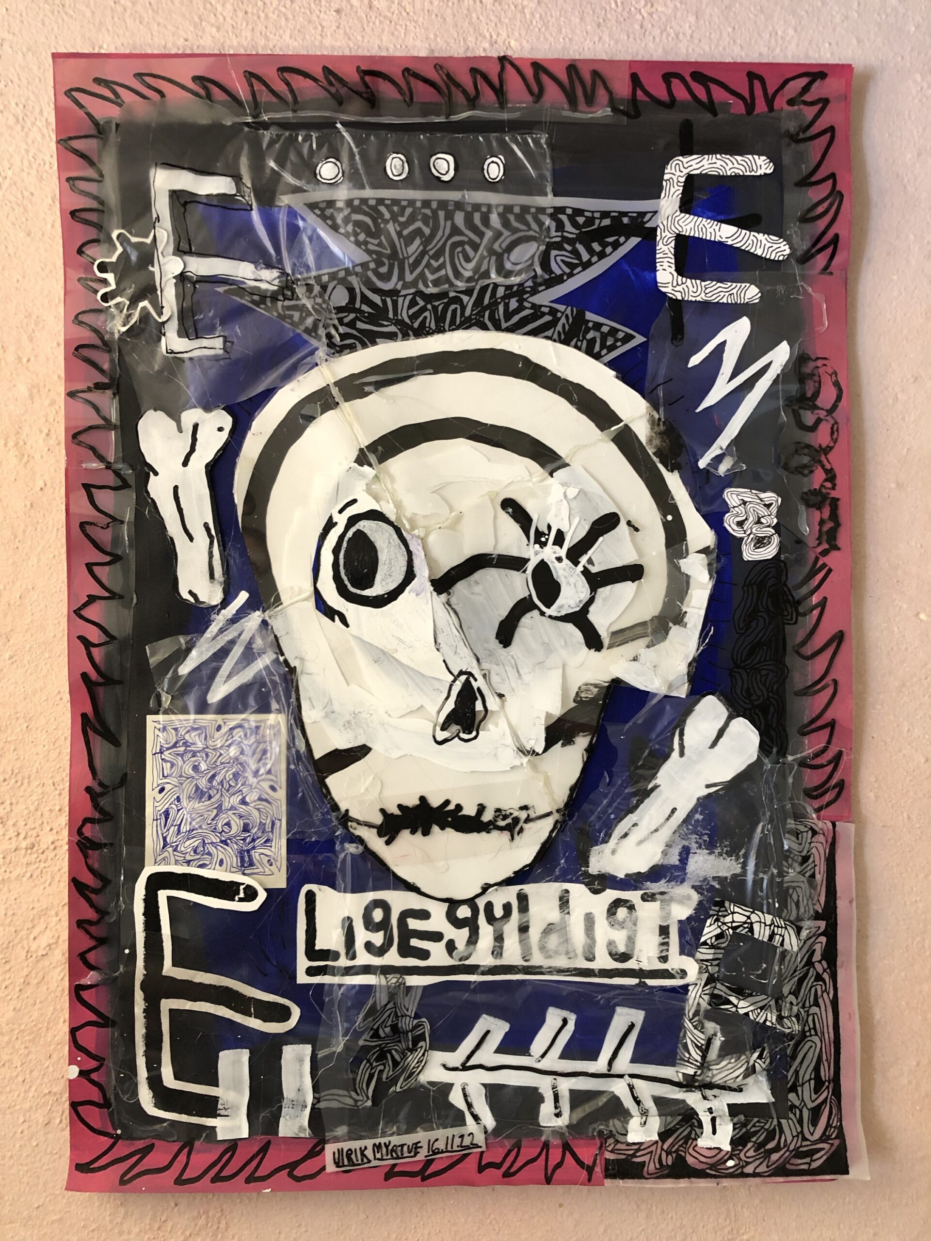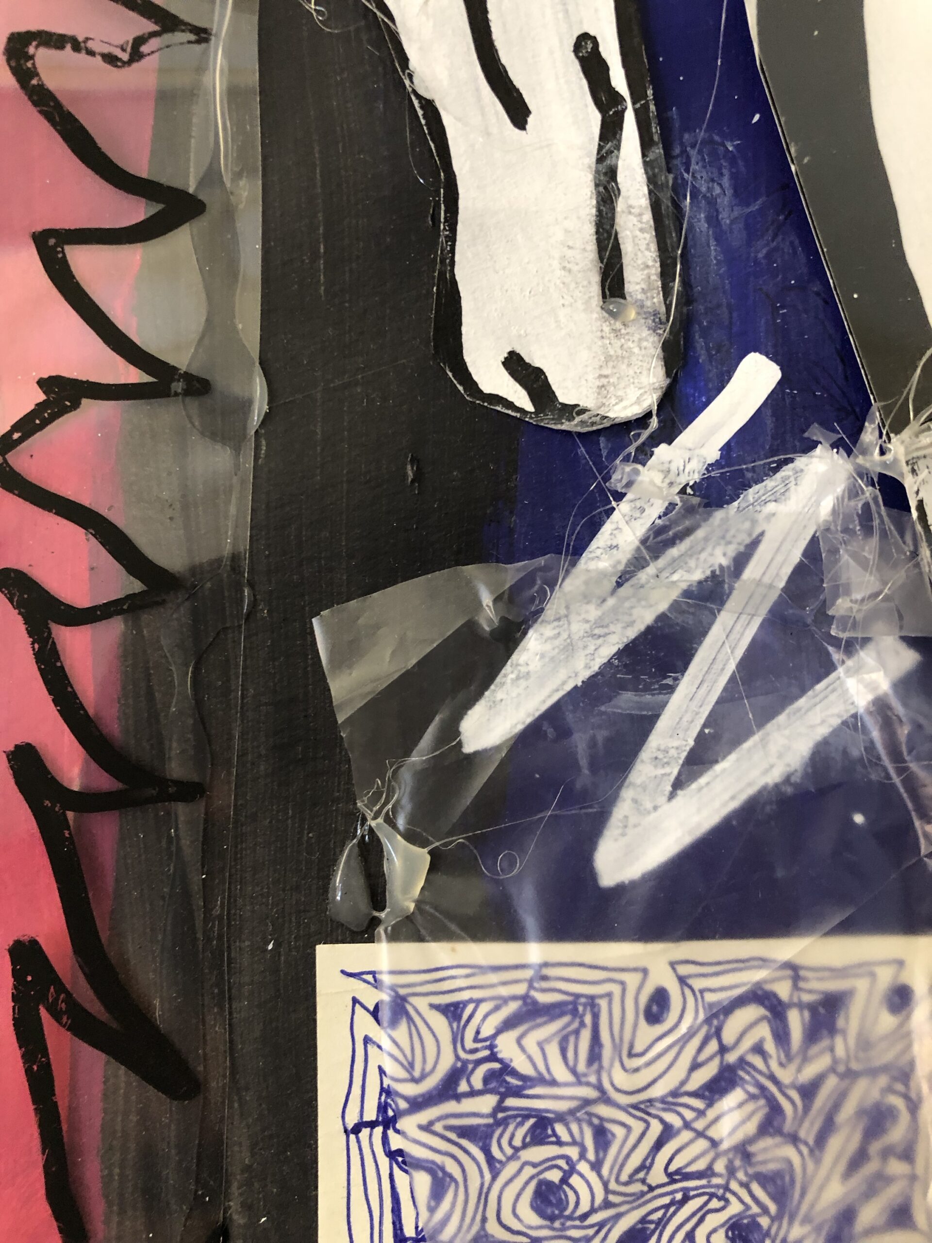 Collage. Blandede materialer, herunder tusch, maling og kuglepen, toiletpapir, silketryk, transparenter og papir. A2.